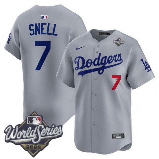 Home>MLB>2025 World Series>Los Angeles Dodgers>Men Los Angeles Dodgers 7 Blake Snell 2025 World Series Cool Base Stitched Baseball Jersey Gray