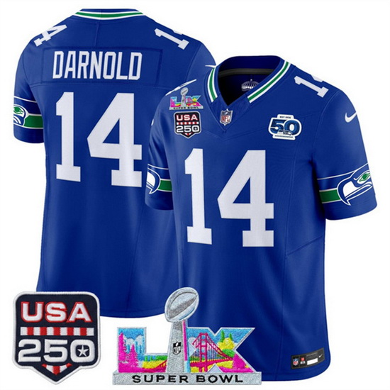 Home>NFL>2025 2026 Super Bowl LX>Seattle Seahawks>Men Seattle Seahawks 14 Sam Darnold Royal 2025 F U S E Super Bowl LX Patch And 50th Season USA 250 Patch Vapor Throwback Limited Stitched Football Jersey