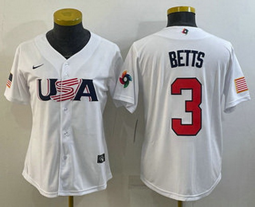 - Women's USA Baseball #3 Mookie Betts 2023 White World Classic Replica Stitched Jerseys