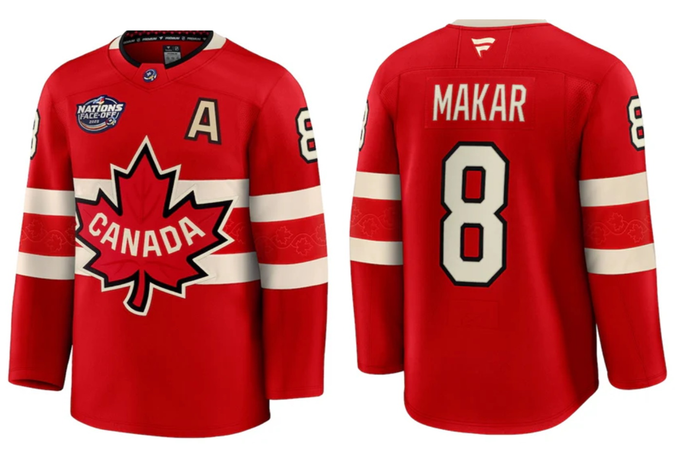 - Men Canada Cale Makar #8 Red 2025 4 Nations Face Off Premium Stitched Jersey