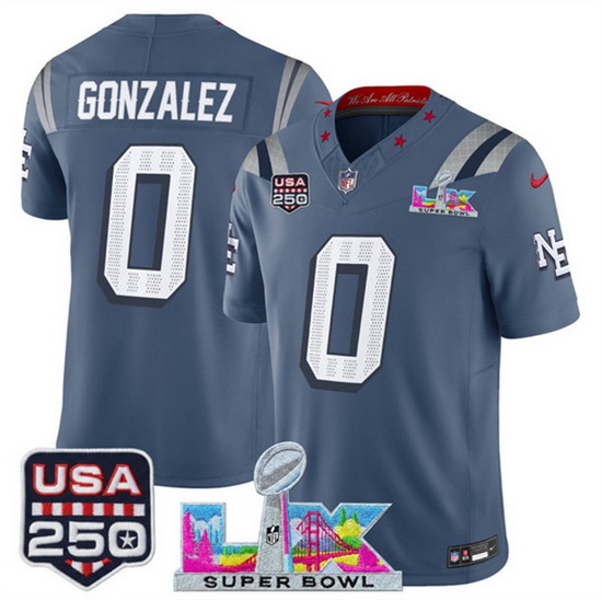Home>NFL>2025 2026 Super Bowl LX>New England Patriots>Men New England Patriots 0 Christian Gonzalez Storm Blue 2025 F U S E Super Bowl LX USA 250 Patch Rivalries Vapor Limited Football Stitched Jersey