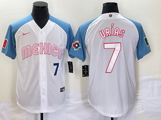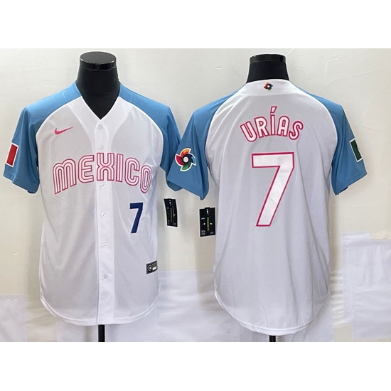 - Men Mexico Baseball 7 Julio Urias 2023 White Blue World Baseball Classic Stitched JerseyS